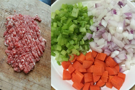 5、将适量的橄榄油倒入炒锅之中,大火加热油开始冒小泡后。把洋葱和西芹丁全部下入油锅中,用锅铲翻出香味。紧接着把西红柿粒和胡萝卜放入炒锅中,反复翻炒一两分钟。再把猪肉糜倒入其中,大火翻炒翻炒至肉糜熟透后。把适量的高汤倒进锅中,再往里逐一加入番茄酱、迷迭香、食盐、少许的胡椒粉。