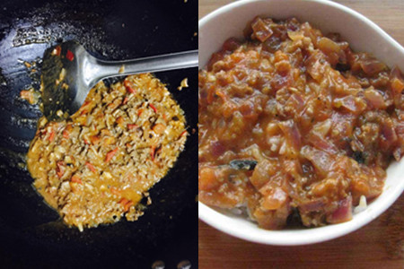 6、炒锅中的汤汁开始变得浓稠后,把肉酱淋在装有米饭的盘子中。在上面铺上些芝士,将烤箱预热几分钟,再把米饭放入烤箱中烤至芝士完全融化,便可食用了。