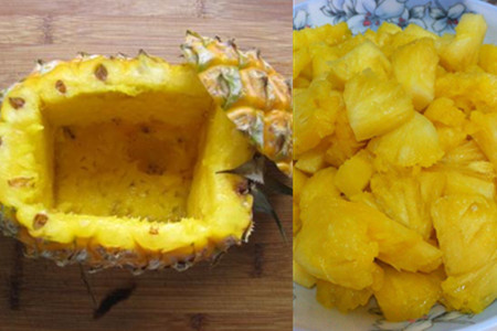 2、先将从超级市场买回的新鲜的菠萝放在菜板之上,用利刀对半切开。用勺子挖掉里面的果肉,留下菠萝壳作为饭蛊。