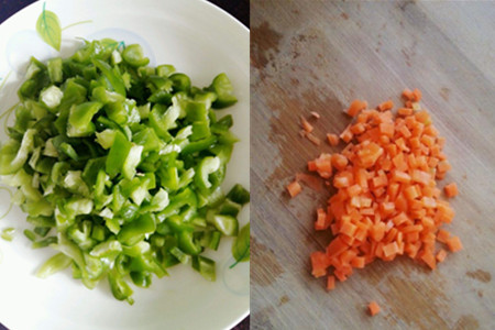 5、胡萝卜用刨子刨掉表皮,洗净后用刀切成小丁状。