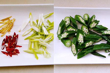 葱姜和干辣椒清洗干净,分别切成细丝备用。煮锅上灶,放入适量清水,调入少许食盐,大火煮开,将秋葵清洗干净下锅焯两分钟,捞出用凉水冲凉,切成斜段待用。