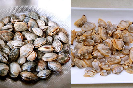 黄蚬子泡在清水中,吐出泥沙,清洗干净,凉水下锅,开火煮熟。捞出煮熟的蚬子,将蚬子肉取出,再把蚬子肉放入煮蚬子的开水中清洗一下。