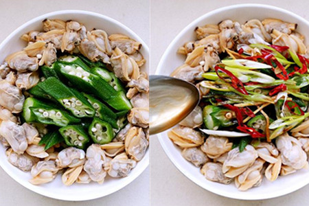 准备好一个大盘,将秋葵段码在盘子中间,蚬子肉码在盘子四周,淋上适量煮蚬子的汤汁,加入葱姜丝和干辣椒丝。另准备一个小碗,取比例为1:5的香油和清水装入碗中,搅拌均匀,淋在秋葵和蚬子肉上。炒锅上灶,放入少许食用油烧热,油热之后,将热油浇在盘子中间,拌匀即可享用。