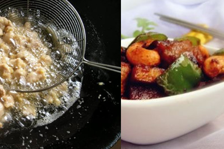 4、将适量的食油倒入炒锅里,把腰果下入油锅中,炸至表面颜色微微发黄便可用漏勺捞出控油。腰果一定要冷油下锅,刚炸好的腰果吃起来不脆,但是晾凉的腰果吃起来却很香脆。
