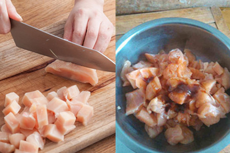 2、先将从超级市场买回的新鲜的鸡胸肉用刀挑干净上面的筋膜,再放在水龙头的流水下冲洗一遍。再放在菜板之上,用刀切开小丁。