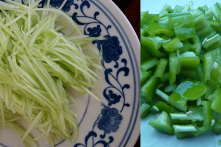 4、把新鲜的杭椒择去蒂部,放在清水里清洗干净,再切成小块状。黄瓜用刨子刨掉外皮,冲洗后用刀切成细丝。
