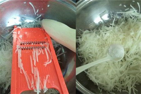 接下来就是把白萝卜表面的泥洗干净,再把皮去掉,然后把白萝卜擦成丝儿。把白萝卜全部擦成丝儿后,再加一勺盐在里面,搅拌均匀,腌制十几分钟。白萝卜腌制好后,就带上一次性手套,用手把多余的水挤掉,然后再把萝白萝卜放在肉末里。我们再加一点盐在里面,也是顺着一个方向搅拌均匀,白萝卜饺子馅就做好了。