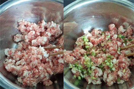 我们先把买回来的猪肉洗干净,然后用刀剁成末。一般情况下,在买猪肉那里会有绞肉机,卖猪肉的阿姨或者叔叔会给你绞。我们再把买回来的生姜,葱剁碎,然后加在肉沫里。然后我们再依次把鸡精,香油,酱油倒在肉末里,用手搅拌均匀,搅拌的时候我们可以带上一次性手套。而且在搅拌的时候我们要注意,要顺着一个方向搅拌,搅拌出来的肉末才好吃。
