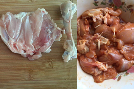 2、先将从超级市场买回的冷冻的鸡腿,放在装有冷水的大盆中解冻,再清洗干净上面的血沫子。接着把它摆在菜板之上,用刀剔除里面的大骨,再切成小丁。往里逐一加入些葡萄酒、食盐、黑胡椒粉进行充分地抓捏,摆在一边腌制一会,使其均匀地入味。
