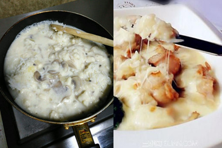 7、把米饭装入一个碗中,在上面浇上之前炒好的奶油蘑菇鸡肉汤。根据自己的喜好,在上面撒上芝士。把烤箱事前预热,把米饭放入烤箱中,烤制十分钟芝士融化成金黄便可食用了。