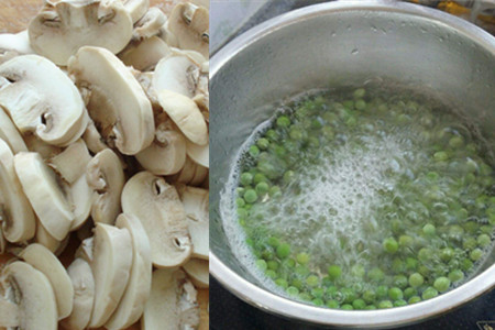 4、将适量的清水倒入煮锅里,把口蘑下入沸水中。焯煮几分钟,再用漏勺将其全部捞出。再把豌豆下入水中,煮熟后捞出。