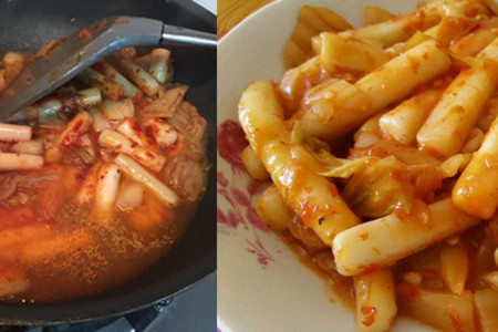 年糕事先无需浸泡,稍微用清水冲洗即可,然后准备一些韩式辣酱、葱花和蒜末,我们就可以开始炒菜了。锅底放一些食用油,加热至五层左右,倒入辣酱,快速翻炒,因为辣酱很容易糊,同时注意油温。接着把葱花和蒜末放进去翻炒,然后把年糕放进去翻炒,可以加一些清水,年糕没熟的时候非常坚硬,所以我们可以多加些 水炖煮一会儿。