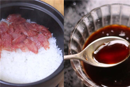 然后揭开锅盖,倒入综合酱汁。这个时候就可以开吃了,煲仔饭一定要趁热食用,不然香气散发光了吃起来就会大大失色了。
