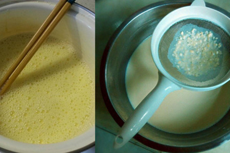8、往小碗中打入几个鸡蛋,用蛋清分离器将鸡蛋黄取出。用搅蛋器把蛋黄液搅拌均匀,再把之前煮锅里的牛奶糊倒入蛋黄液中。用筛子把低筋面粉过筛一遍,把它倒入蛋黄牛奶糊中进行充分地搅拌。把蛋黄牛奶糊用筛子再过滤一遍,这样蛋挞水就算制作完成了。