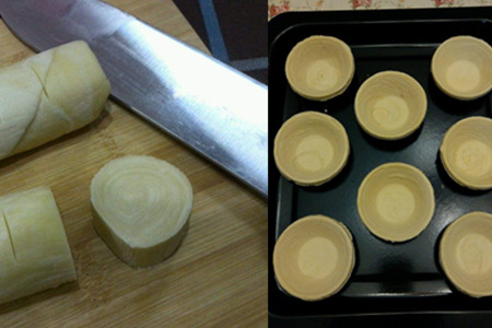 9、把面卷从冰箱中取出,把它分成等量大小的面剂子。在一个盘子中平铺上些许的干粉,把面剂子放在上面,让面剂子的底部蘸上少量的干粉。紧接着把面剂子放入蛋挞模具中,用拇指由中间向四周缓缓推开,挞皮要紧贴着模壁,而且一定要分布均匀,不然会影响烤制出来的效果。