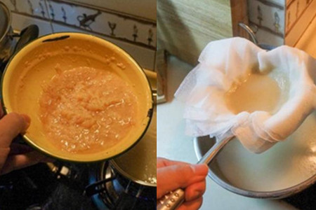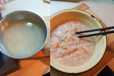 第三步:鸡脯肉洗干净,用工具打成碎茸状,用冷却好的汤汁浸泡肉茸,减半均匀。之后将其加入煮沸的汤汁里面。可以观察到:热汤里面的很多杂质纷纷吸附在了肉茸上面。