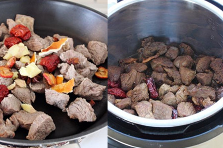 重新起锅,把清洗干净的牛肉块倒入锅中,加入八角、桂皮等香料,翻炒均匀。炒出香味之后,烹入适量老抽、食盐和清水,转为大火煮沸,再转入高压锅,通电压十分钟。