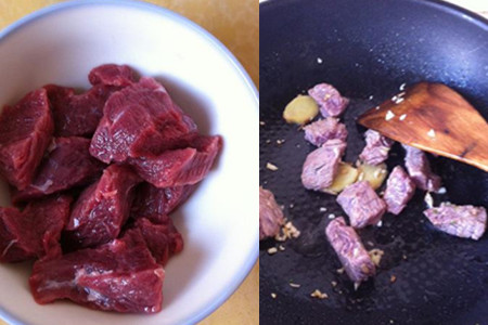 牛肉清洗干净,剔除肥油,切成大块待用。大火烧热炒锅,倒入牛肉块煸炒,把牛肉块的水分炒干,盛出锅,用清水冲洗干净待用。