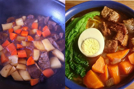 用练出的肥油把萝卜块炒香。将高压锅压好的牛肉倒入,加盖,大火煮沸,再转为中小火炖煮。萝卜块炖软烂之后,将大葱洗净切斜段下锅,翻炒至葱段断生变软即可熄火出锅。将面条煮熟盛入碗中,浇上炖好的牛肉即可。