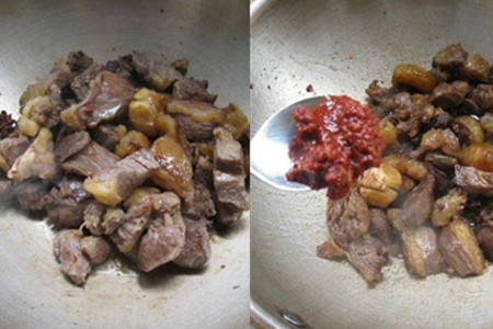 牛肉块要提前放入炒锅中炒干水分、炒香。家里没有昭通酱可以用黄豆酱或者豆瓣酱代替,也可以不放酱。