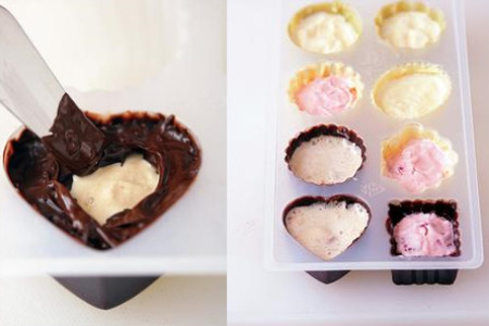 一个小时之后,我们将模具取出,再融化部分的巧克力,将巧克力继续涂抹在模具的内部,再放入冰箱中冰冻一个小时,在这个期间,我们取出买回来的冰淇淋,将冰淇淋自然的融化,等到冰淇淋融化成糊状之后,将它放在一旁备用。我们取出模具,在模具中倒入适量的融化了的冰淇淋,注意倒冰淇淋的量不要倒得太满,太满的话就做不出好看的冰淇淋月饼了。