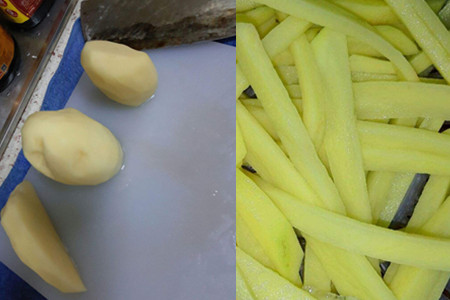 土豆需要去除外皮,因为土豆是一种非常容易氧化的食物,所以我们刮掉外皮后需要放在清水里浸泡,然后拿出来用刀切成长条。吃过薯条的人都知道要切成半厘米宽度就可以,太粗不容易炸熟,而太窄又容易糊,所以对刀功还是有要求的。切好的土豆条需要用清水浸泡一会儿,把外层的淀粉去除掉,这样土豆条就不容易变黑了,外观也好看。