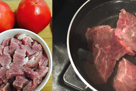 牛肉的肉质非常鲜嫩,所以我们在正式做菜之前可以把西红柿的外皮去掉,因为外皮吃起来比较硬,做熟后口感不好,我们把柿子洗干净之后,放在开水里滚一下,放凉后就可以轻松地扒掉外皮了。牛肉在制作之前需要用清水清洗干净,然后放在开水里焯一下,去除掉血沫子,这样炖出的肉更好吃一些。然后把西红柿切成块,牛肉切成小块,容易入味。