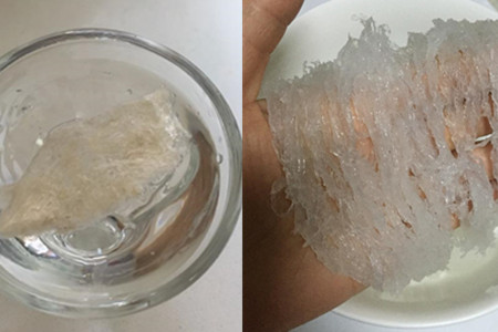 step4. 待燕窝完全处理好后,沿其纹理将其撕成条状,燕窝头较厚的部分可借助剪刀将其剪开或选择直接用手将其撕开,使其变成细条状。