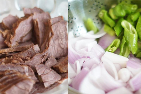卤牛肉切成大片,青椒洗净去籽切段,洋葱洗净切大片。