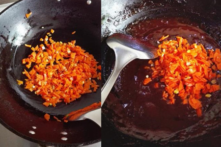 大火烧热炒锅,放入少许食用油,下葱花炒香。葱花炒香之后,将胡萝卜丁下锅煸炒,炒至断生后盛出备用。