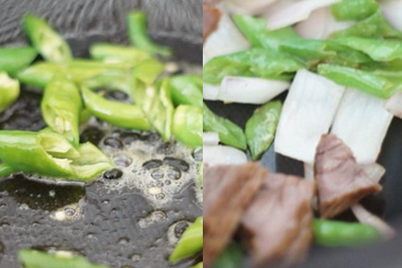 大火烧热炒锅,加入油烧热,油热之后,将豆豉下锅爆香。豆豉爆出香味之后,将青椒段下锅煸炒。青椒段炒至发焉后,再将洋葱块下锅一起煸炒。青椒和洋葱都炒熟之后,往锅里调入适量食盐,倒入切好的卤牛肉片,翻炒几下即可出锅。比较辣的青椒可以先去掉辣椒籽,这样炒出来的菜肴就不会很辣了。