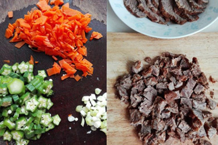 秋葵洗净,用开水烫一下,切成碎末。胡萝卜去皮切碎,小葱去掉根须,洗净剁成碎末。卤牛肉取三分之一切成大片,剩下的切成小丁。准备一个大碗,将豆瓣酱和韩式辣酱都装入这个碗中,搅匀待用。