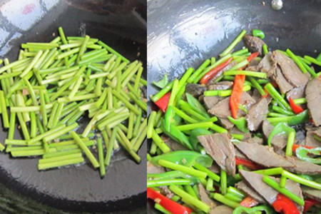 食材:蒜台200克、卤牛肉200克、红辣椒1个、青辣椒1个、姜、盐、油、生抽、鸡精。