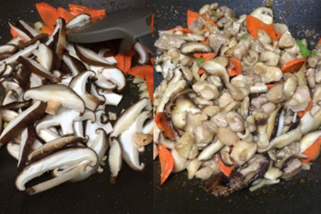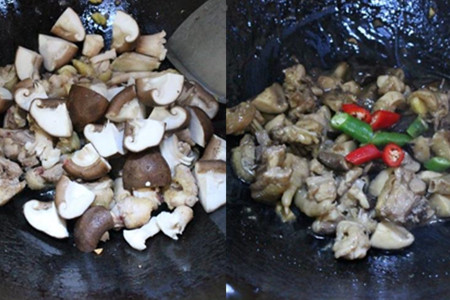 香菇炒至发焉后,将腌好的鸡块下锅一起翻炒。鸡肉块炒熟之后,调入适量蚝油和生抽,炒至入味即可起锅装盘。