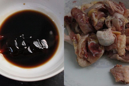 准备一个小碗,依次碗中加入半勺蚝油、半勺生抽和半勺料酒,搅匀待用。将鸡块清洗干净,斩成小块待用。