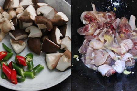 香菇洗净去蒂,每朵切成四小份,青红椒洗净切小段待用。大火烧热炒锅,加入适量油,油热之后,将姜蒜末下锅煸炒。姜蒜末炒出香味之后,将切好的鸡块下锅,快速翻炒。