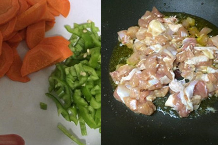 胡萝卜削掉外皮,切成小片。青椒清洗干净,切碎待用。大火烧热炒锅,放入适量油,将腌制好的鸡腿肉下锅煸炒,炒至无血色装盘待用。