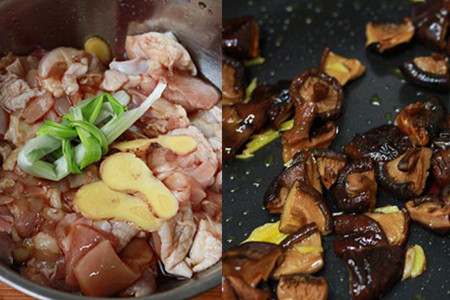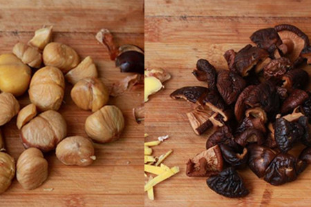 煮锅上灶,倒入适量清水,大火烧开,放入生栗子煮十五分钟左右,捞出栗子,晾凉去壳。干香菇放入温水中泡发,香菇水不要倒掉留着备用。香菇泡发好之后,挤掉水分,切成小朵。生姜清洗干净,一半切成丝,一半切成片。