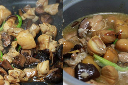 大米清洗干净,装入电饭煲中,加入炒好的香菇鸡块,用铲子把菜和米搅匀,再兑入一半的香菇水。接着加入适量清水,使得水面稍稍高于大米,再调入适量食盐,搅拌几下,放上剥掉壳的栗子,按下煮饭键。电饭煲跳闸之后,先不要打开盖子,让饭菜在锅中继续焖十分钟再开盖盛出锅食用。