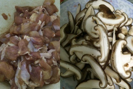 琵琶腿清洗干净,用剪刀去掉骨头,再将鸡腿肉剪成小块,装入盆里,加入适量料酒、葱段、白糖、姜片,拌匀,腌制二十分钟。大火烧热炒锅,放入适量食用油,油热之后,下姜丝爆香,再放入香菇块煸炒。
