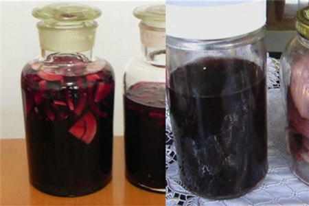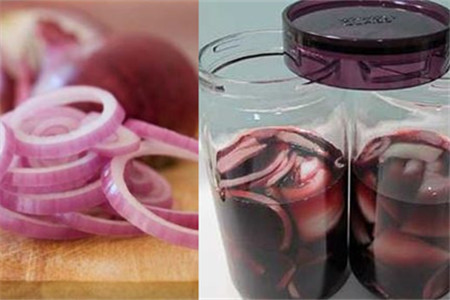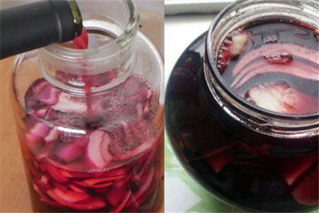 我们将切好的洋葱全部装入玻璃瓶中,然后再加入红酒,之前剥下来的皮也可以一起加进去,效果会更加显著。我们将玻璃瓶中的洋葱片,用过滤网过滤,洋葱,酒分开装入瓶中,然后放在冰箱的冷藏室里。要是喜欢甜一点的,可以加一点蜂蜜。每天只能饮用一次,每次大约50ml就可以了。浸泡过的洋葱片也是可以食用的,而且比之前的作用会更加显著。
