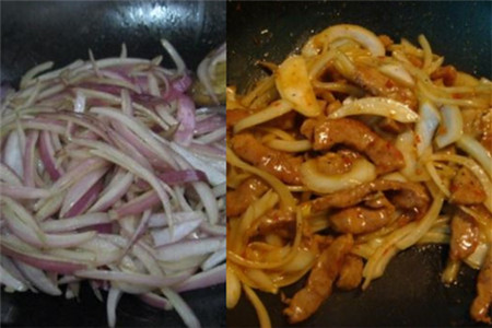 我们先把锅烧热,然后添加适量的植物油,等油热了以后,就把腌制好的猪肉全部倒在锅中,然后快速的翻炒。炒的时候候我们可以开大火,一直要等到把肉炒变色为止。等肉变色后,就可以把洋葱也倒进锅里,然后翻炒均匀。等洋葱和肉要熟了的时候,就可以加一点鸡精,盐,干辣椒,然后再翻炒均匀就行,再装在盘子里面。