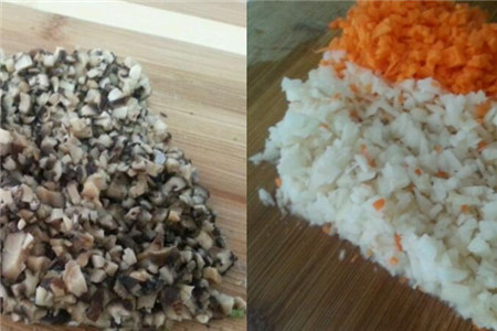 把猪肉清洗后剁成肉糜,肉糜尽量剁的细一些,也可以使用料理机进行研磨。葱姜放在一起,用清水浸泡熬煮成葱姜汁。糯米需要提前浸泡2个小时左右,然后淘洗干净。干香菇用水进行泡发,然后切成小丁。胡萝卜半根切成圆片状备用,半根切成小丁。藕清洗干净后切成小丁状。
