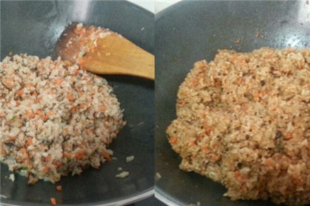 将肉糜、香菇丁、藕丁、胡萝卜丁放在一起,加入生抽、老抽、葱姜汁、盐和白糖。放入炒锅中用锅铲进行翻拌。糯米放入电饭锅中,加水煮熟冷却备用。然后开小火将混合好的食材炒熟,接着将糯米饭也放入锅里翻拌煸炒。等所有材翻拌好且上色均匀以后,馅料就基本调配好了。