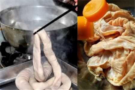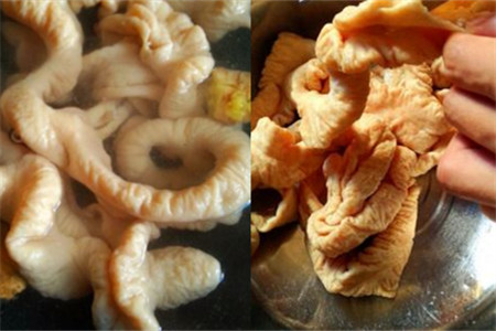 我们先讲如何清洗肥肠,大家都觉得洗肥肠是一件非常痛苦的事情,特别是在冬天的时候。我们可以烧一点热水,把肥肠先浸泡在热水里,然后我们再清洗,这样比较容易洗干净。还有就是很多觉得肥肠有股臭味,我们可以用盐水清洗,那是还怕洗不干净的话,也可以把肥肠里面的一层换到外面来,这样洗起来也方便,而且还洗得非常的干净,还可以除味。