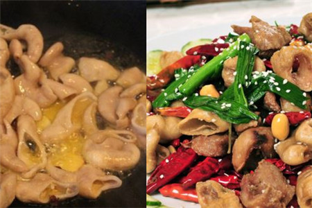 我们把买回家的肥肠要用盐反复的搓洗几遍,用盐洗后,还要把肥肠放在锅里煮上一小时左右,煮的时候要加料酒和生姜。煮好后,就把肥肠捞起来沥干,然后切成段。我们要多准备一点生姜,辣椒,葱,蒜,洋葱,这样才可以把肥肠的味道掩盖住。把锅烧热,然后把肥肠和生姜一起倒在锅里煸。然后倒油,放花椒,辣椒翻炒均匀就可以了。
