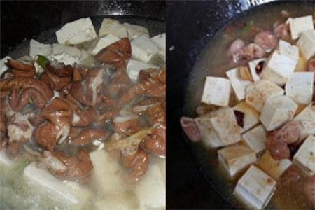 我们把豆腐切成正方形块,等锅里炒香后,就可以把豆腐倒进锅里。我们再往锅里添加适量的盐,料酒,老抽,然后轻轻的翻炒一下,因为豆腐易烂,所以炒的时候一定要轻一点。然后我们再添加适量的清水,多煮一会儿。我们可以利用煮豆腐的时间,把肥肠放在另一个锅里煮,煮的时候可以什么都不放,只要把它煮熟就可以了。