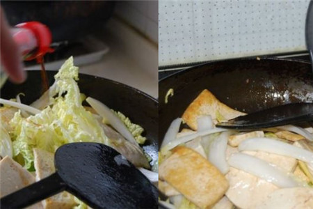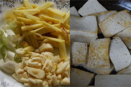 我们先把豆腐切成块,在切之前一定不要洗豆腐,豆腐是非常容易烂的。还有就是把大葱,大蒜洗干净,切好备用。我们把娃娃菜洗干净,可以拿在自来水龙头下冲洗,然后把娃娃菜切成四半。在炒锅中倒入适量的有,然后把它烧热,就可以把葱和生姜放在锅里炒香。炒香后,就把豆腐倒在锅中,轻轻的翻炒,等它煎一会儿。
