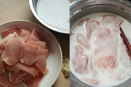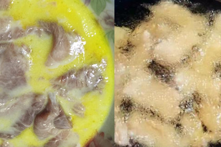 这道美食的原料一定要里脊肉,因为不含肥肉,炸熟之后吃起来不腻,这是这道菜的绝妙之处。买肉的时候注意不要买冷冻肉,买新鲜的猪肉,里脊洗干净之后,需要沥干水分,因为我们要腌制一会儿。里脊需要切成薄片,这样不仅容易炸酥,腌肉的时候也容易入味,取一些精盐、胡椒粉和蚝油放在肉片里,充分搅拌之后腌制十分钟,可以打一个生鸡蛋。