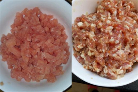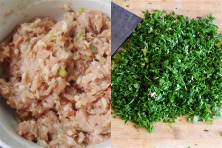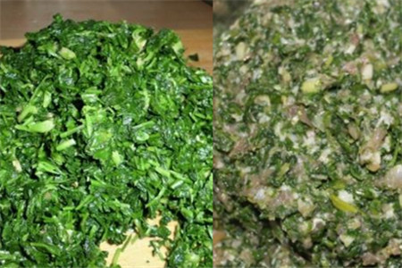 我们将荠菜摘好,然后洗干净,捞起来沥干。将葱切成葱花,白菜洗干净后也要剁细,然后将水挤出来。我们将瘦肉用热水洗干净,然后切成小块,再把它剁成末。荠菜我们也要把它剁得细细的,然后用手把它的水挤出来。把所有剁好的菜全部放在盆子里,然后依次加入盐,香油,花生油,十三香,味极鲜,再搅拌均匀。